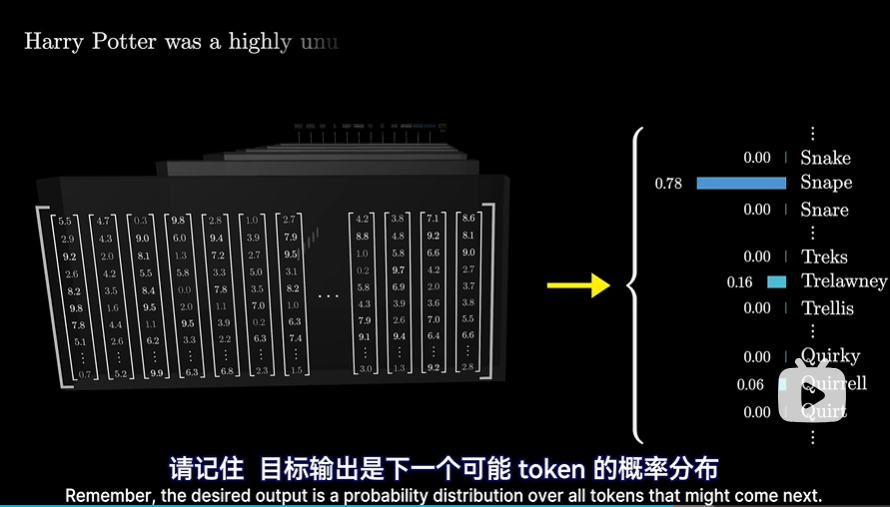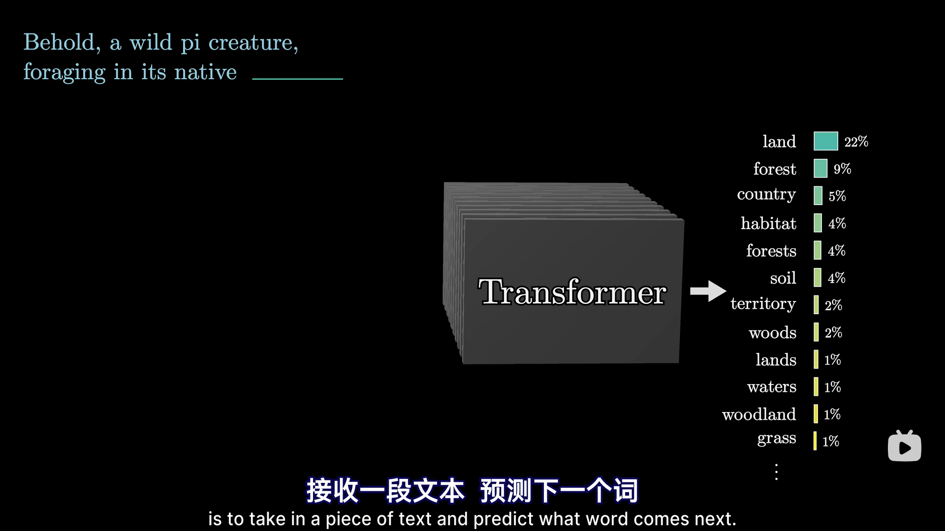 Transformer是一种特殊的神经网络,一种机器学习模型,也是现在大语言模型的核心技术之一。大预言模型所做的事就是给模型输入一段话,然后让模型预测下一个词的概率,如果我们想让文本生成下去,那么就把新预测的词加入上一段对话,然后再把最新的对话再次输入Transformer,这样就可以持续进行文本生成。