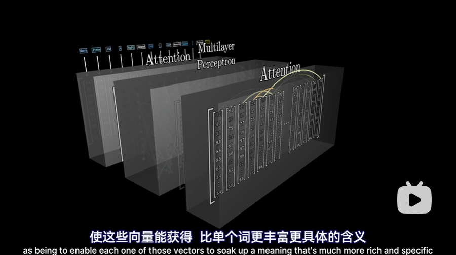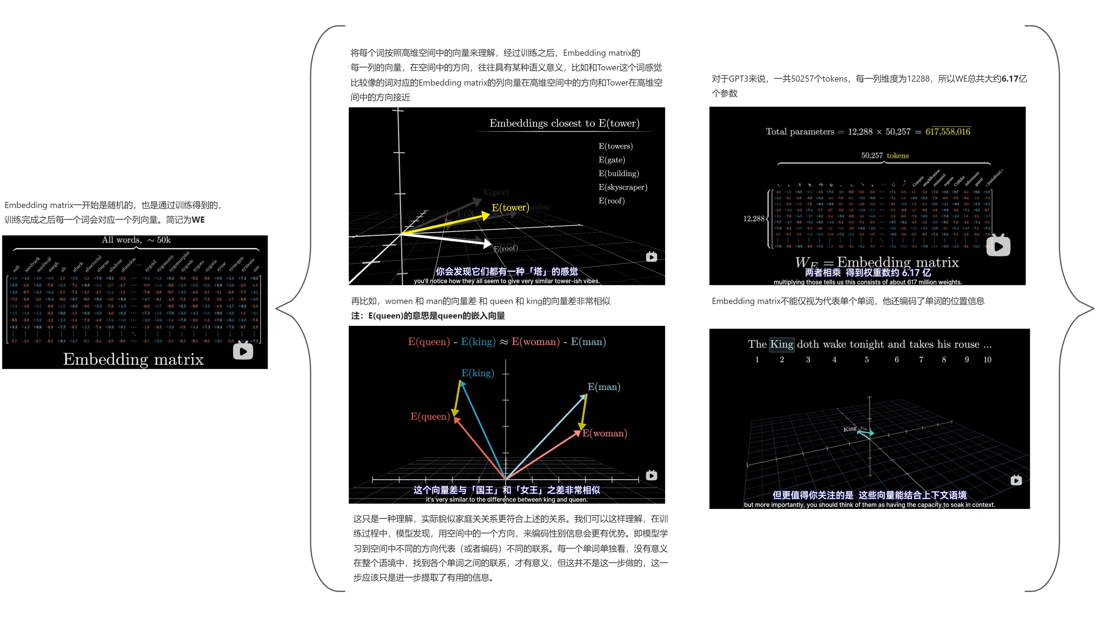 在第一步,即没有上下文的时候(类似于我们在chatGPT中新建对话),即根据输入文本创建向量组时,每个向量都是直接从嵌入矩阵(Embedding Matrix)中拉出来的,即最开始,每个向量只能编码单个单词的含义,没有上下文信息。而之后,流经这个网络,就能使这个词获得比单个词更丰富更具体的含义。