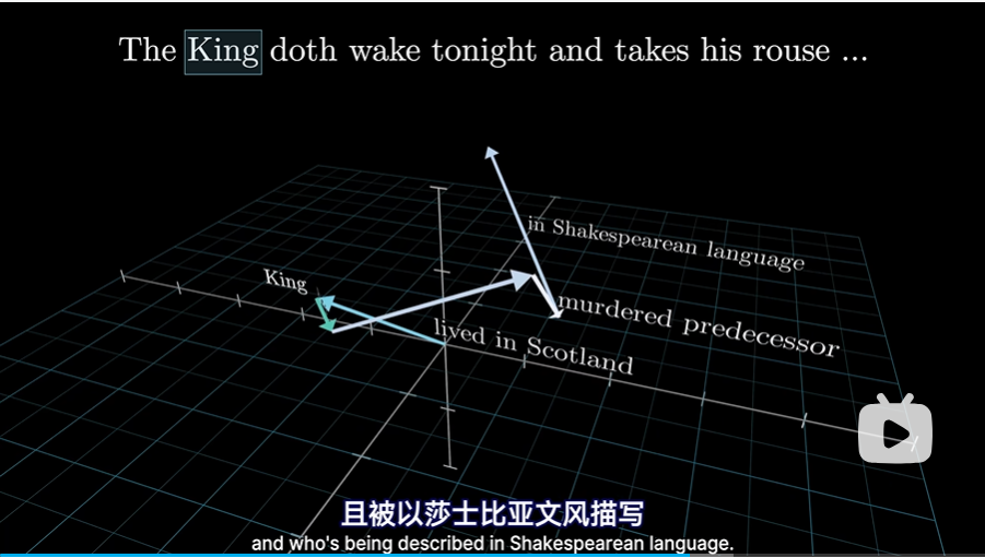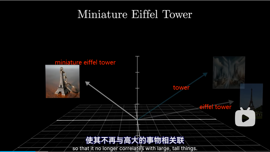 - 考虑词“tower”的嵌入向量,也许是高维空间中某个很泛型,不具体的方向,也可以认为在高维空间中表示泛型的一个向量,和“高大的物体”一类名词相关联。总而言之,是个很泛型不具体的词