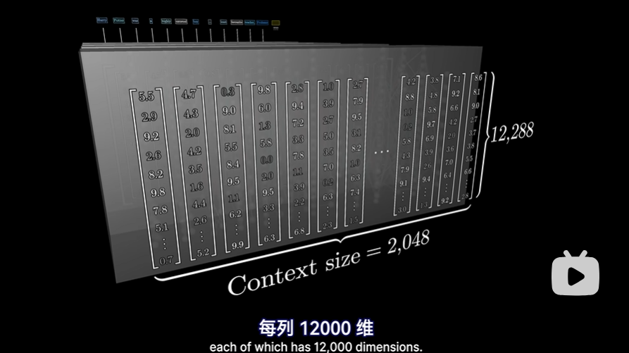 这种网络一次只能处理特定数量的向量,称作上下文长度,例如GPT-3的上下文长度为2048,因此流经网络的数据有2048列,每列12000多维度
