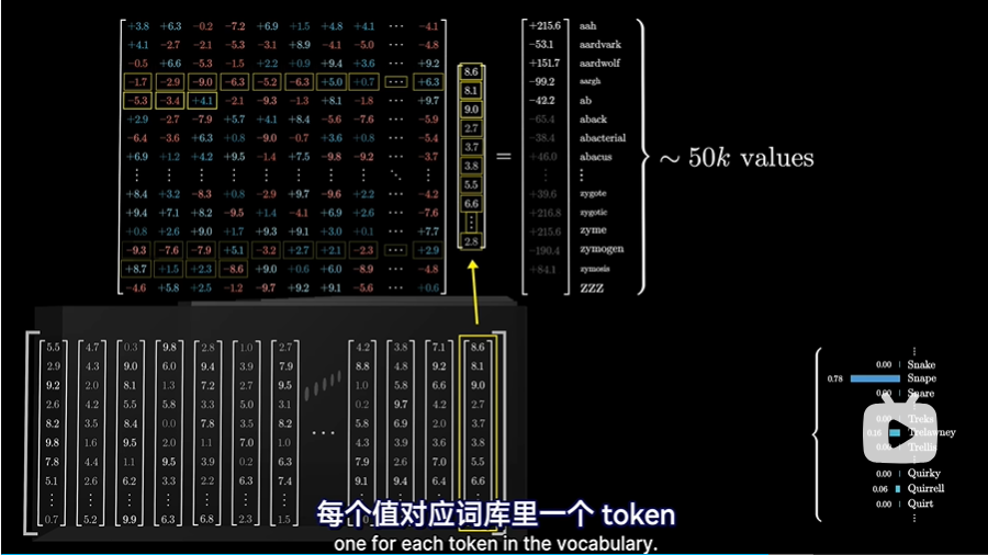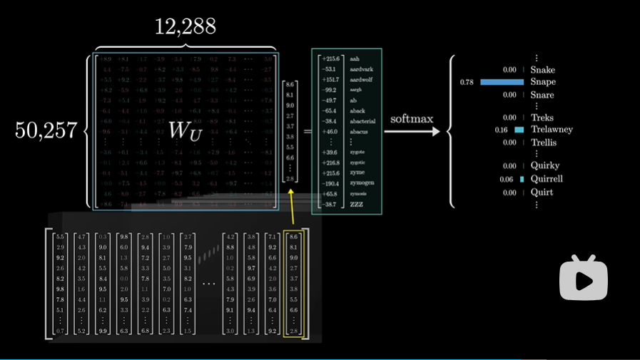 - 将上下文中的最后一个向量,通过一个矩阵(称之为“解嵌入矩阵Unembeding matrix”,记为Wu)映射到一个包含50000个值的列表中(对于chatGPT来说是50257),每个值对应词库里的一个token: