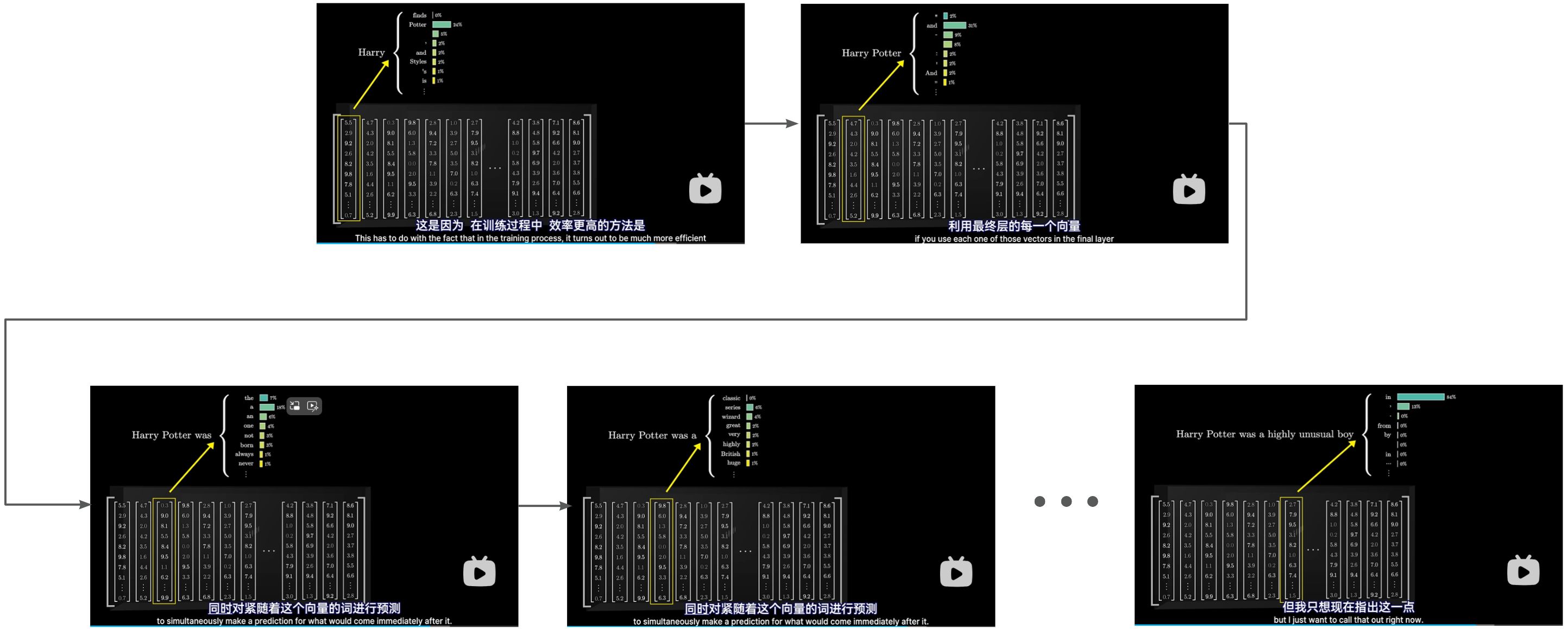 此时让我们想一下,只用最后一个嵌入来做预测,是不是有些奇怪?毕竟在最后一层中,还有成千上万的其他向量,都蕴含着丰富的上下文信息,他们中的任何一个都可以用来预测下一个token的概率,因为他们中的任何一个也已经结合了上下文信息。如果都用最后一个来做预测,那么直接使模型的最后的输出为一个列向量就好了,为啥还要有这么多输出,但我们只选取最后一列?解释如下: