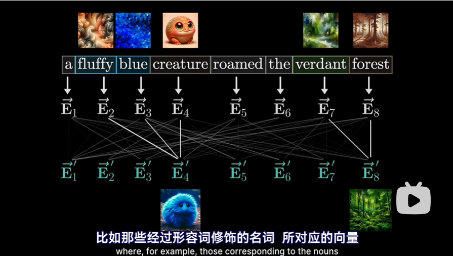 以以下短语“a fluffy blue creature roamed the verdant forest”来说明和形象理解单头注意力机制,注意我们只关注“形容词调整对应名词的含义”这种类型的更新,以方便理解,实际注意力机制内部到底发生了什么是理解不了的,只是通过训练调整了大量的参数。需要再次注意两点: