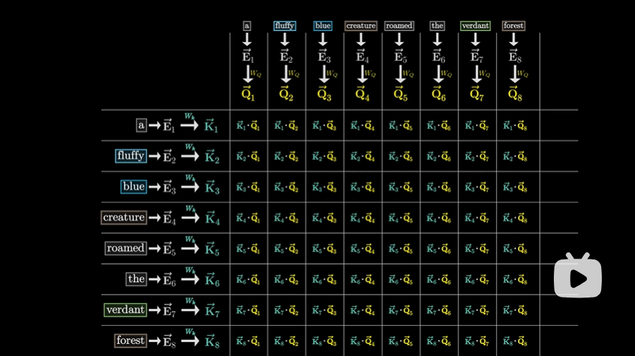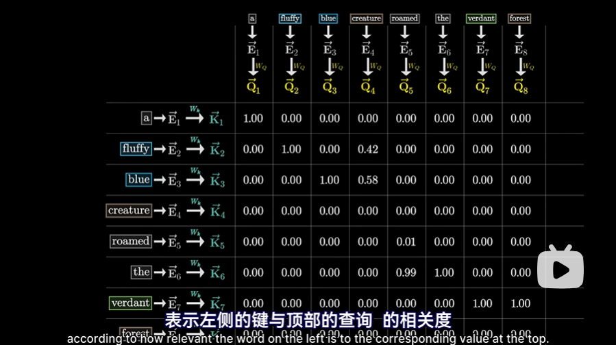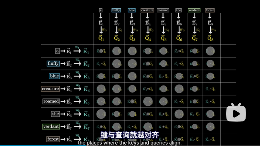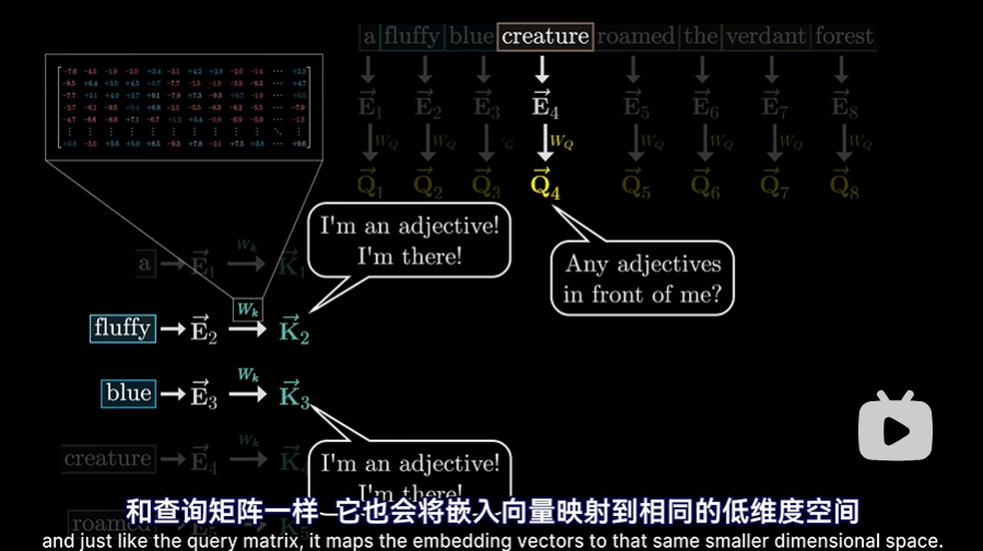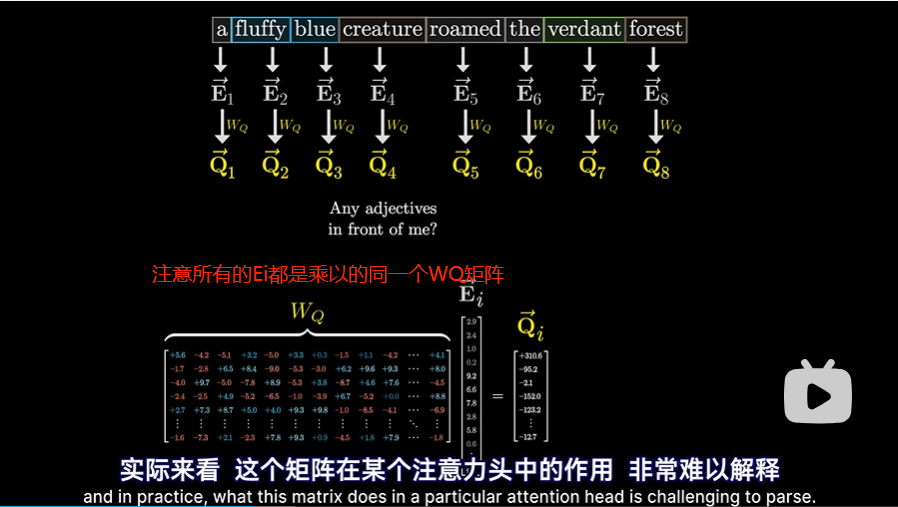 - 每一个嵌入向量Ei,乘以一个WQ矩阵会得到一个Qi向量这个Qi向量仿佛在提出对应的问题(Query),比如我前面有形容词吗?