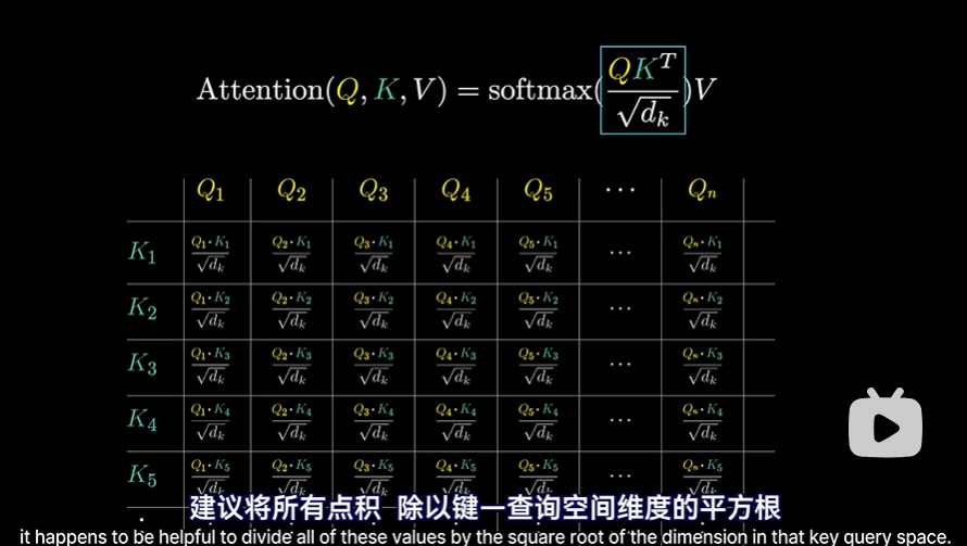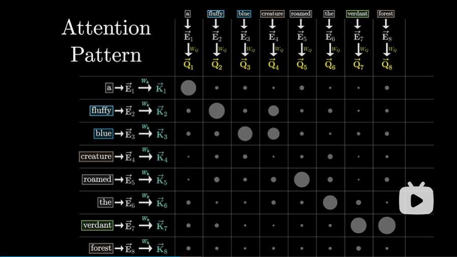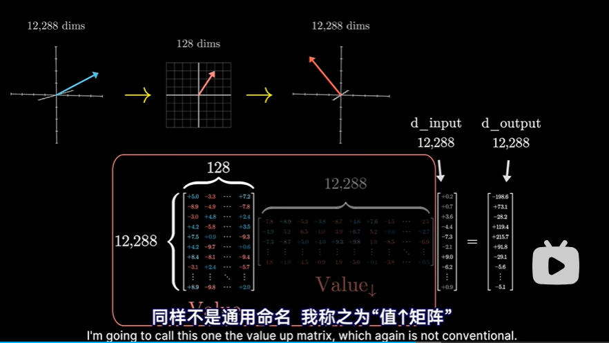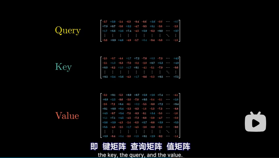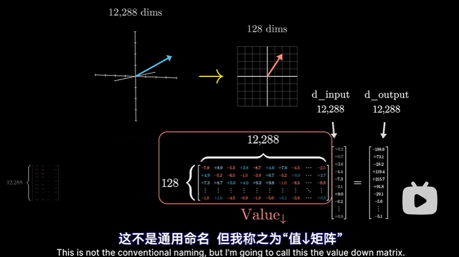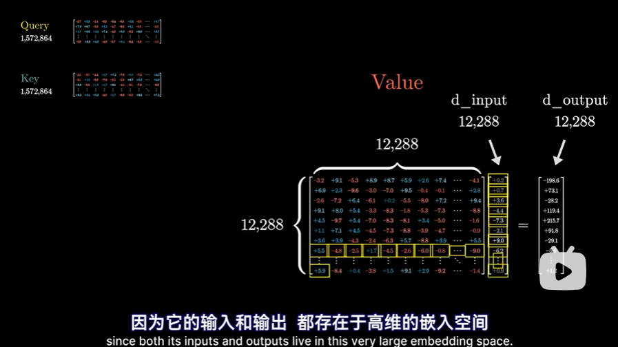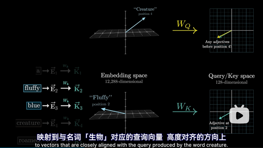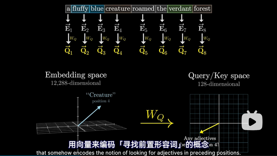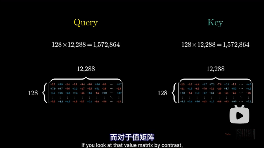 - 这个查询矩阵WQ将“嵌入空间(12288维)”中的名词,映射到较小的“查询空间(128维)”中的某个方向,所有的Qi组成了Q矩阵