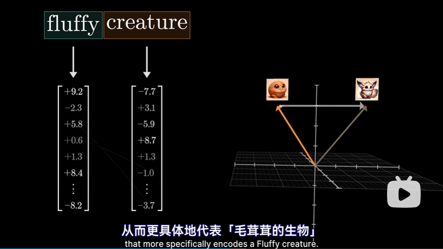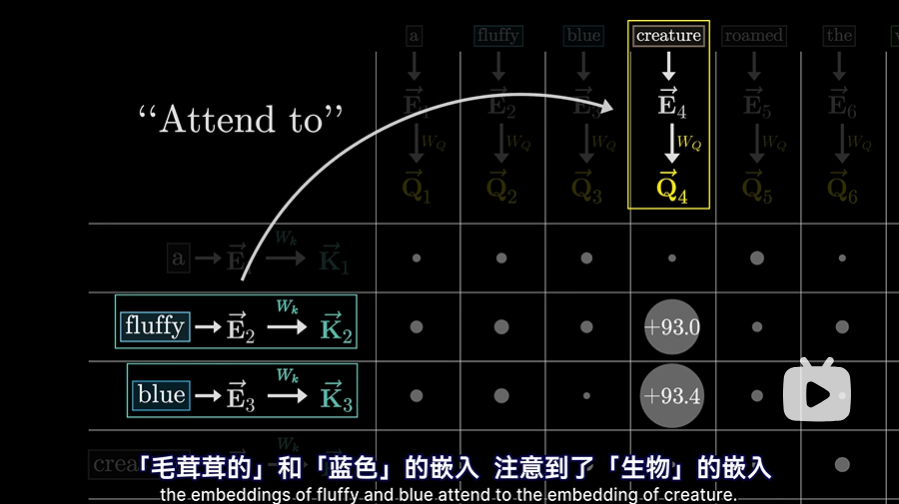- 对于这个例子来说,由“fluffy毛茸茸”和“blue蓝色”生成的键确实与“creature生物”产生的查询高度对齐。用机器学习的方式描述就是“fluffy毛茸茸的”和“blue蓝色”的嵌入注意到了“creature生物”的嵌入