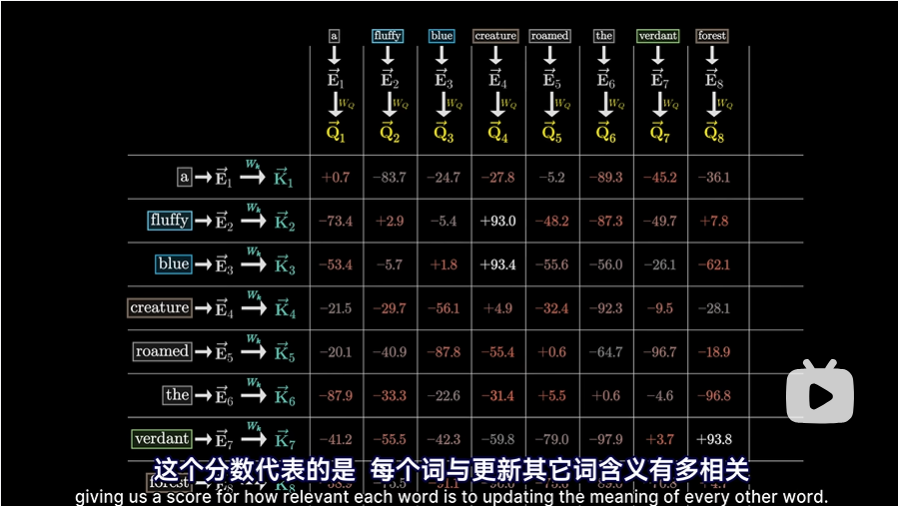- 这样网格中的值可以是负无穷到正无穷的任何实数,这个值代表的是每个词与更新其他词含义有多相关,如果值小,意味着这个词对于更新其他词的含义相关性不大