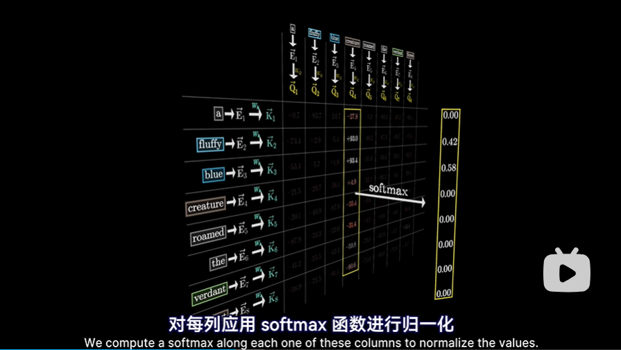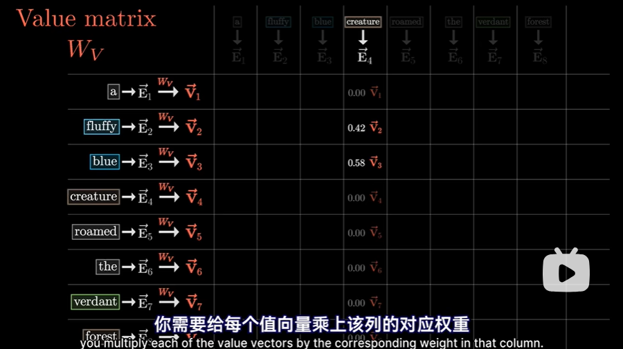 - 再次回到注意力模式网格,通过之前的Q K矩阵,我们已经计算出了各个单词之间的注意力模式,那么其实接下来需要的就是,利用Wv矩阵,计算出一系列值向量。这些值向量,可以想象成是与对应的键向量相关联。然后: