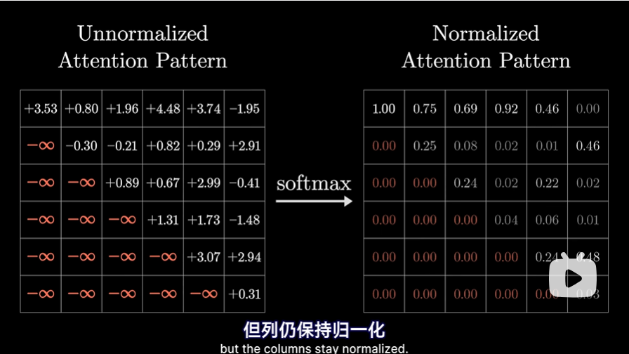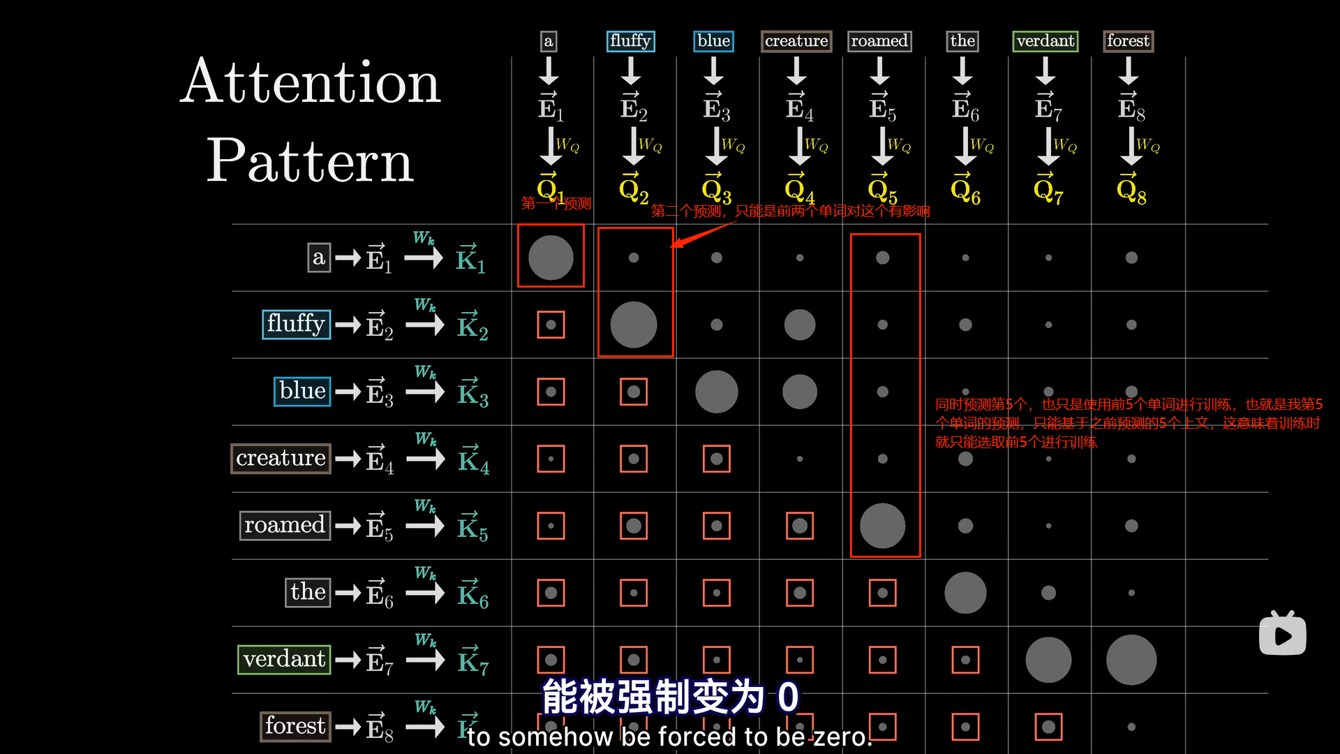 但这意味着,对于注意力模式而言,不能让后词影响前词,不然会泄露之后的答案,这样就没法进行上述所说的训练了。这意味着我们要使注意力模式的左下方,这些代表着后方token影响前方token的地方能被强制变为0