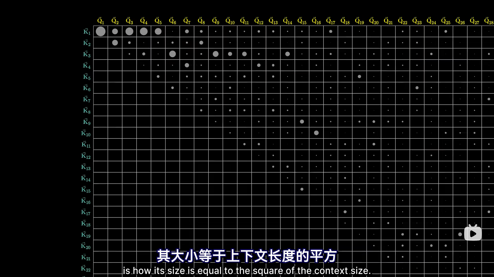 - 另一个注意的点是,注意力模式的大小,等于其上下文长度的平方。这也是为什么上下文长度会成为大语言模型的瓶颈。所以出现了许多的注意力机制变体,这里不介绍