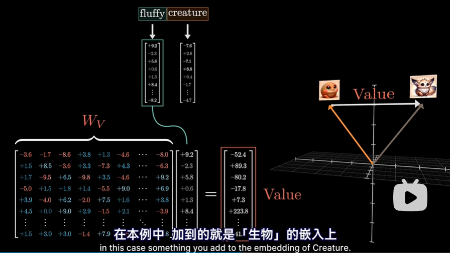 - 此时就要引入值权重矩阵Wv,用它乘以前面那个词的嵌入向量(如fluffy)得到值向量,这就是你要给后面的词嵌入(如creature)所加的向量。所以值向量与嵌入向量处于同一个高维空间。可以这样理解:如果这个词,需要调整目标词的含义,那么要反映这一点,得对目标词的嵌入,加上什么向量呢?