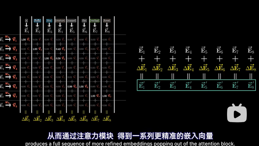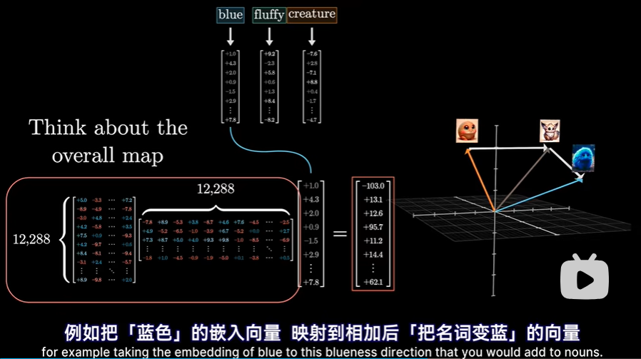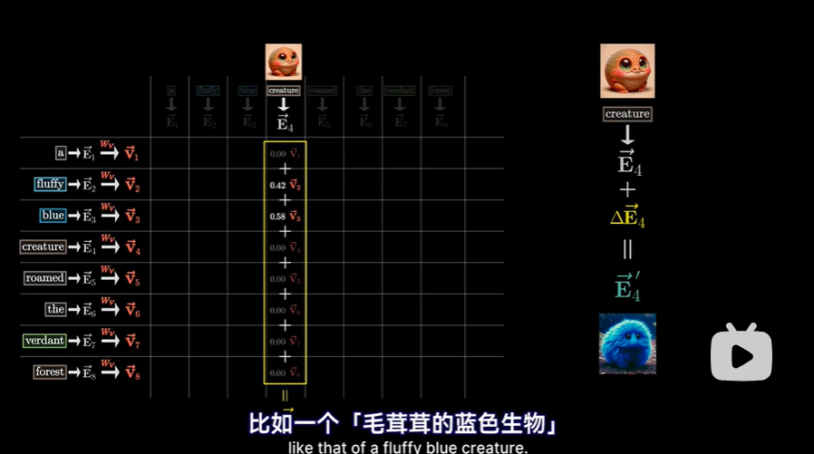 - 对每个值向量,乘上该列对应的权重,这里也好理解,因为权重越大意味着这两个词关联性越强。例如这里对于“creature生物”一词的嵌入,要加上“fluffy毛茸茸的”和“blue蓝色的”的值向量的大部分贡献。