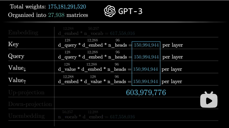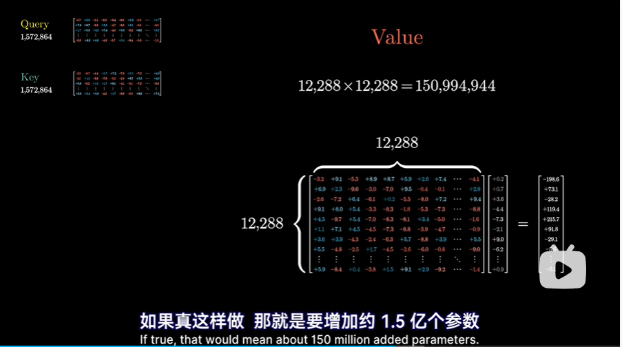 - Key和Query矩阵均是128行,12288列,大约每一个150万个参数