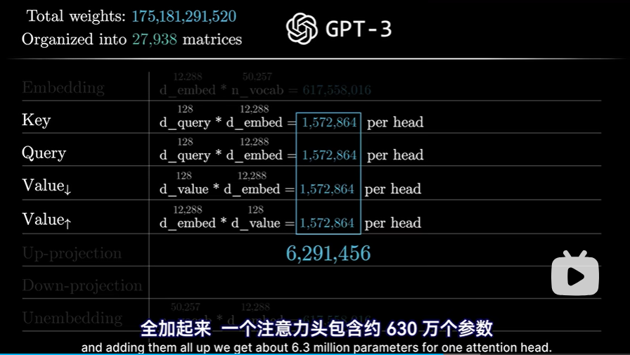 - 把他们加起来,一个注意力头(自注意力头)包含约630万个参数