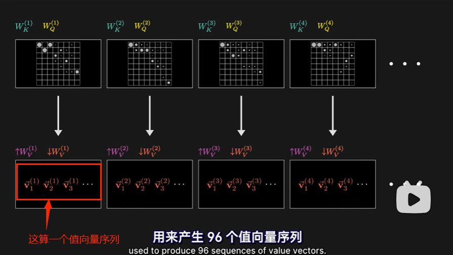 - 96个注意力头,产生96个不同的注意力模式,每个注意力头都有独特的值矩阵,用来产生96个“值向量序列”