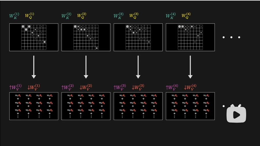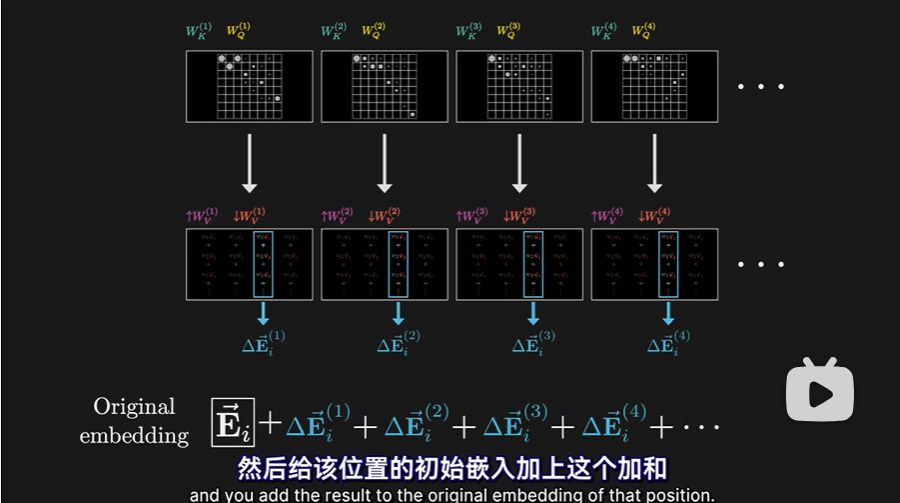 - 这意味着,对于上下文中的每个位置,也就是每个token,每个注意力头都会给出一个要加入到该位置嵌入向量的变化量,然后要做的就是把各个注意力头给出的变化量加起来,然后给该位置的初始嵌入加上这个加和