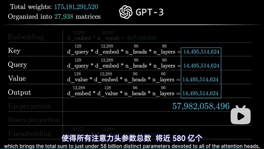 - GPT-3包含了96个不同的层,所以 键、查询、值的参数总和,还得再乘以96,使得所有注意力头参数总和接近580亿个